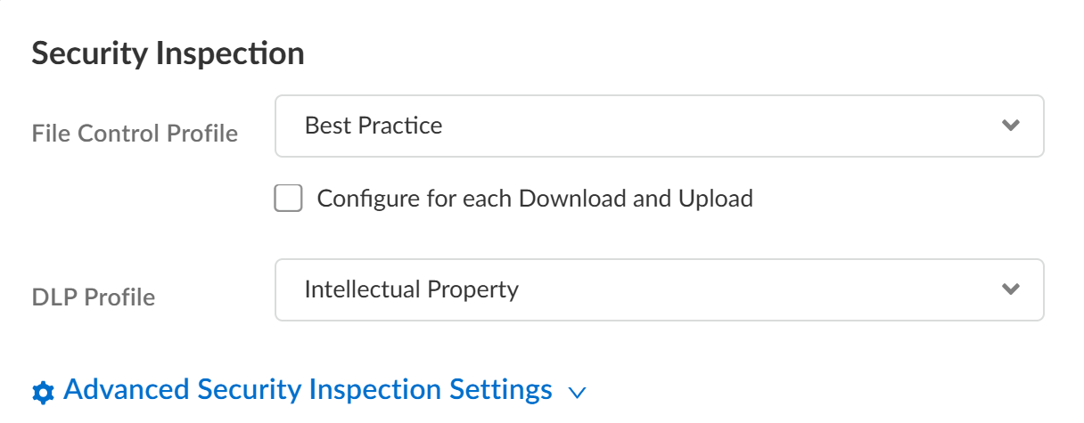 (Allowed GenAI Apps) In the Security Inspection section, select a file blocking and Enterprise DLP profile to prevent exfiltration of sensitive data.- File Control Profile—A File Blocking profile allows you to identify specific file types that you want to block or monitor. You can create a custom File Blocking profile or use the default Best Practice File Blocking profile.