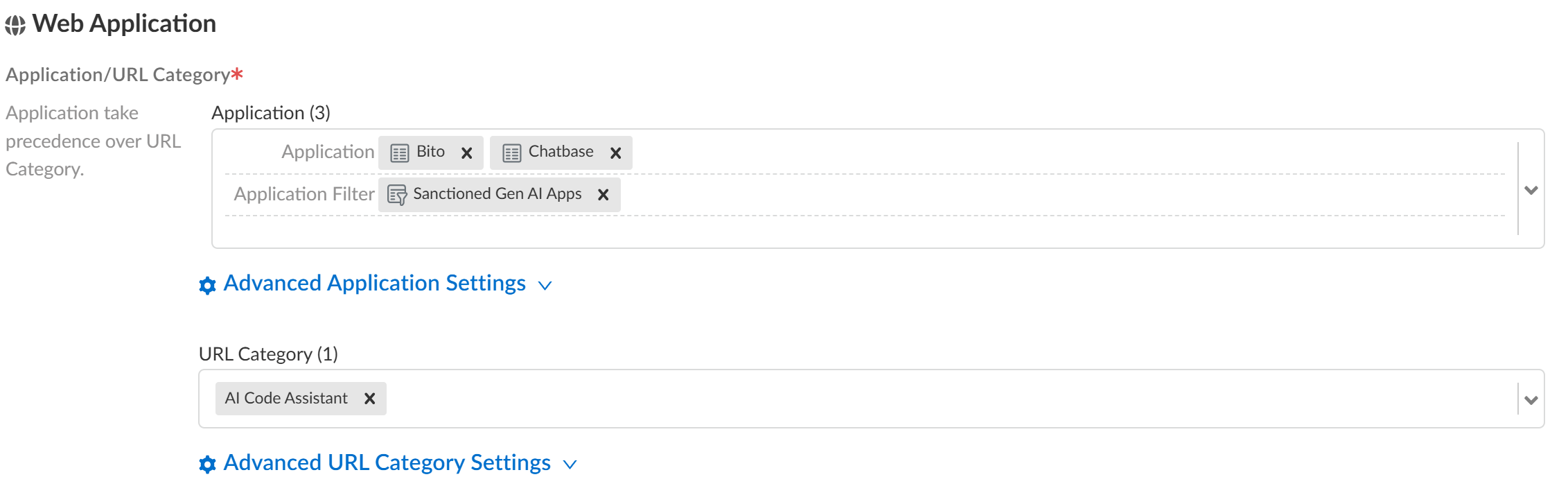 In the Application settings, specify the GenAI Application Group, Application Filter, or Applications.(Allowed Web Applications) Only add supported GenAI apps to the list of allowed apps.- Application—Add one or more GenAI apps.