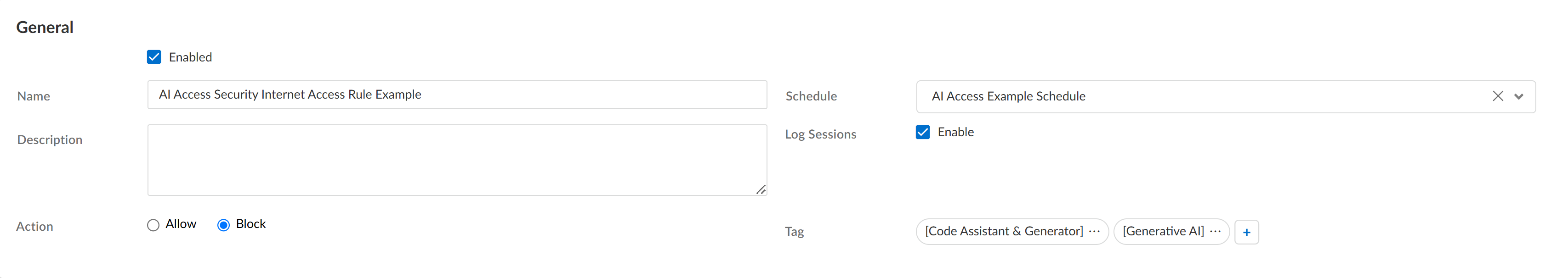 Configure the rest of the custom Internet Access policy rule as needed.Create Custom Policy Rules to Control GenAI App Usage (Panorama)