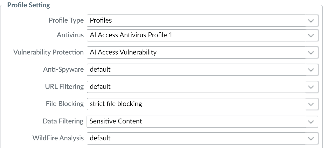 Configure the Security policy rule Actions. Decide what Actions you want to take on your policy rule. As a best practice, attach Security Profiles to enable the firewall to scan all allowed traffic for threats. Select Profiles from the Profile Type drop-down and then select the individual Security Profiles to attach to the rule. Choose the required actions for the following settings for your GenAI apps:- For the Action, configure the Action the NGFW takes when traffic from Security policy rule Source to the Destination is detected.For example, select Allow if you want to allow access to one or more GenAI apps or Deny if you want to block all access to one or more GenAI apps.For the Profile Type, select Profile.At a minimum you must add the Vulnerability Protection and Data Filtering profiles. These are required to generate Threats and Sensitive Assets data when discovering risks posed by GenAI apps. The remaining profiles are optional and can be configured as needed. For each of the Security Profile types below you can select an existing profile or create a new one.
