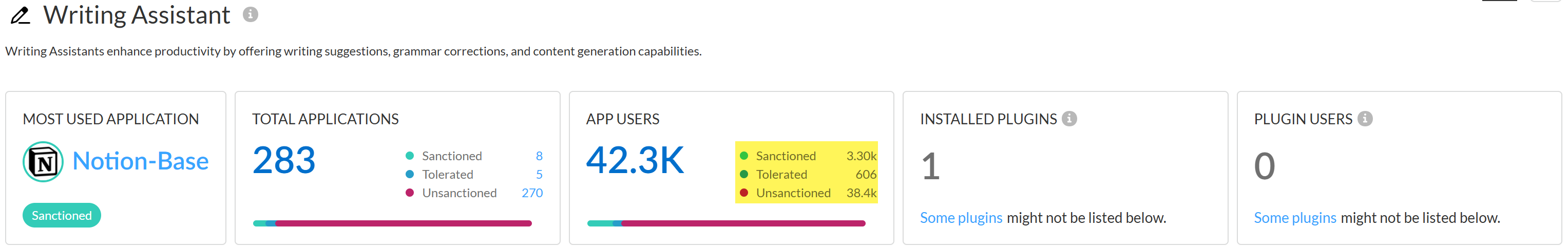 - Select InsightsAI Access to view the AI Access Security Insights dashboard.The dashboard prominently displays the top four GenAI app use cases, based on activity on your network. The dashboard also displays icons for the other use cases.Navigate to details about a use case. For a top use case, click Review use case. For other use cases, click the use case icon.The use case details page displays a table of all the GenAI apps for the use case.Summary information on this page includes the number of INSTALLED PLUGINS and the number of PLUGIN USERS. These numbers are determined from all data that AI Access Security has stored and are not limited to the time period indicated by the time filter. For this reason, these totals might not be reflected in the use case details table.In the use case details table, identify GenAI apps that are installed as plugins in one or more marketplace app instances, and the number of plugin users. This information is shown in the Plugins and Plugin Users columns of the table.For a GenAI app that is installed as a plugin, click the number in the Plugins or Plugin Users columns.Clicking the number in the Plugins column opens the 3rd Party Plugins page in SSPM showing the instances of the GenAI app that users installed as third-party plugins. From here, you can review the plugin information to determine if the plugins are a risk.Clicking the number in the Plugin Users column opens the 3rd Party Plugins page showing details about the users who installed the app as a third-party plugin. Use this information to identify plugin risks posed by individual users.