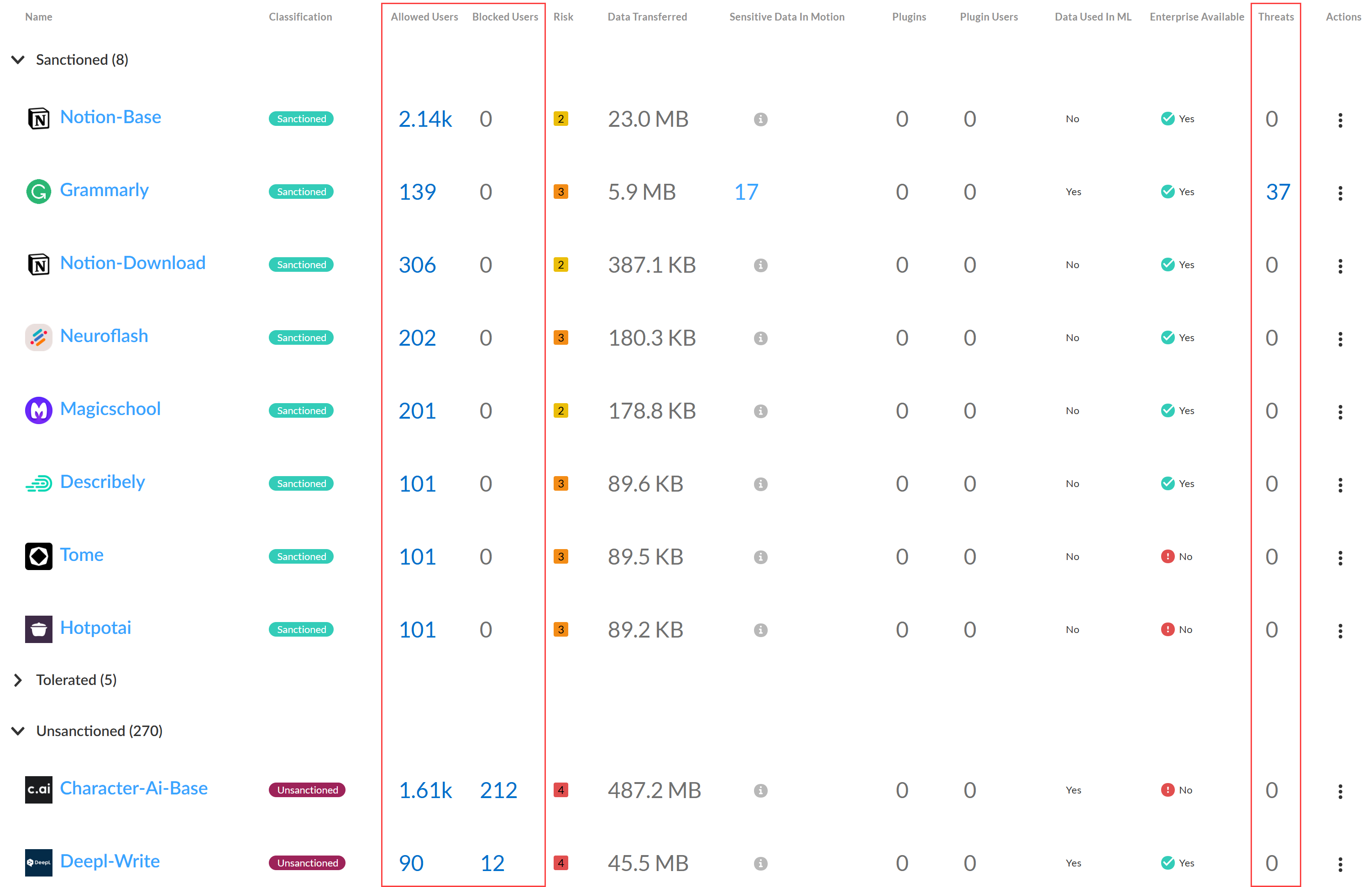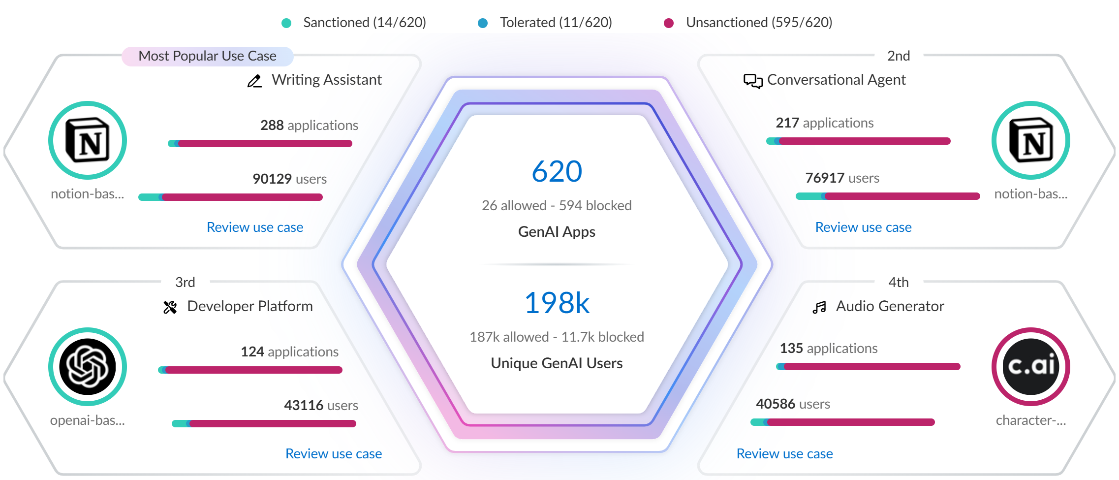 - Users by GenAI Use CaseThis provides a summary of the total number of users accessing each individual GenAI app associated with the selected GenAI use case. The Sanctioned, Tolerated, and Unsanctioned GenAI apps are listed with the total user count for each individual app.Review the Allowed Users and Blocked Users counts to measure the effectiveness of your GenAI app security and access policy rules.