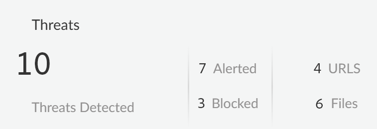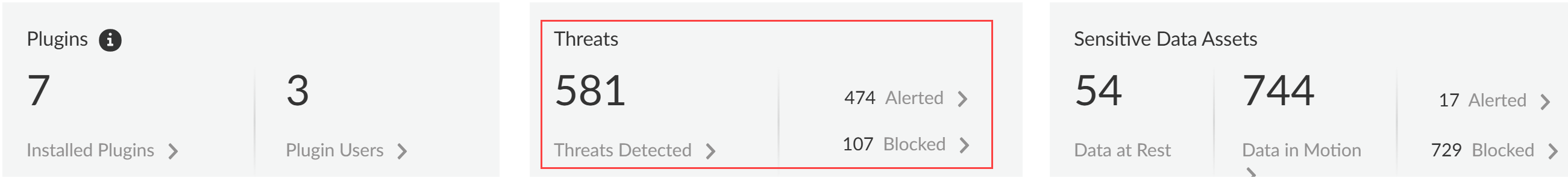 - Threats DetectedThreats are detected by the Vulnerability Protection profile attached to the Web Security policy rule. This profile detects threats such as malicious and phishing URLs, malicious files, or malware. The Threats Detected summarizes all threats across all GenAI apps and enforcement points.