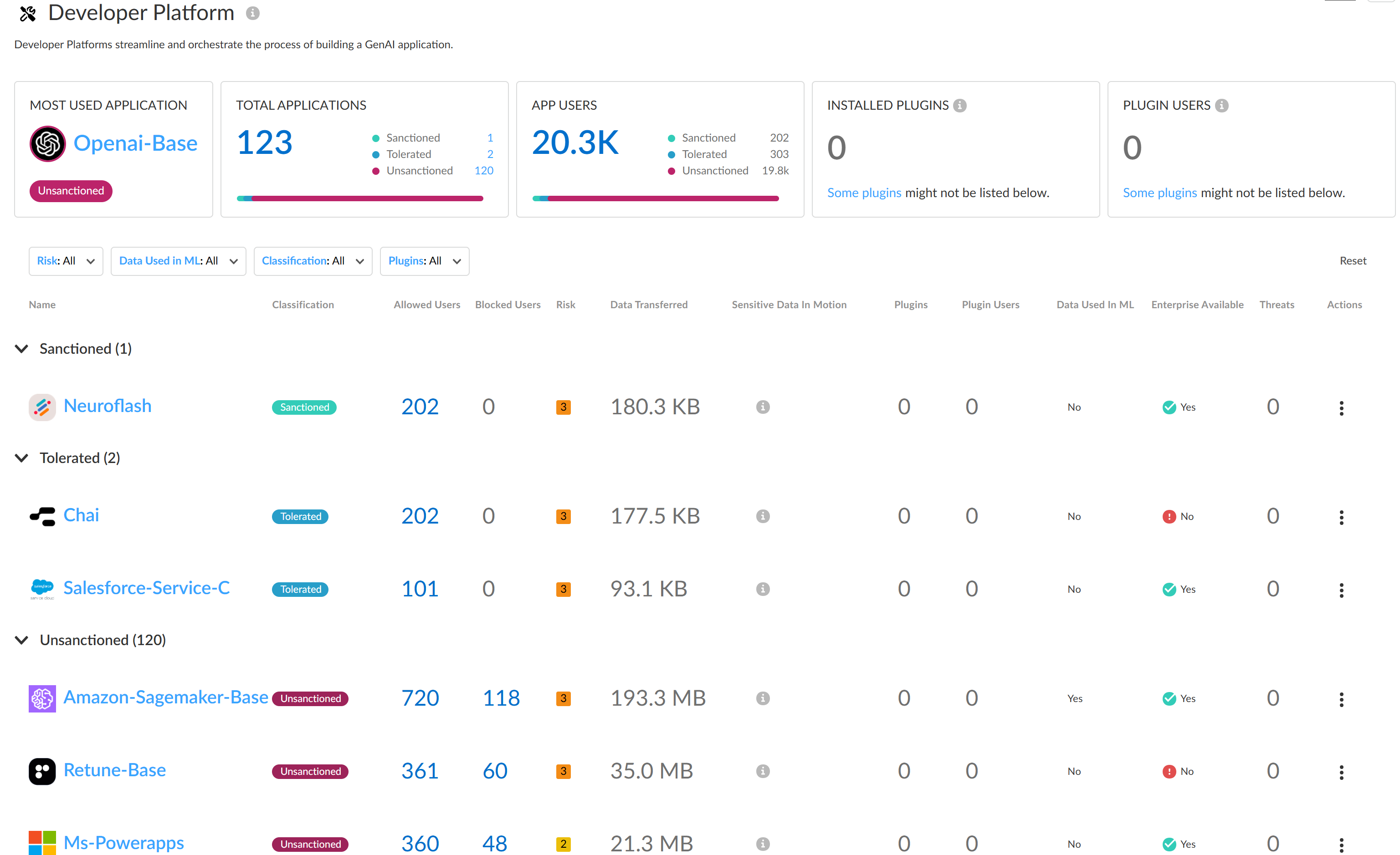 - Most Used Applications—The most used GenAI app for the use case. This also includes the app tag (Sanctioned, Tolerated, or Unsanctioned) currently assigned to the GenAI app.