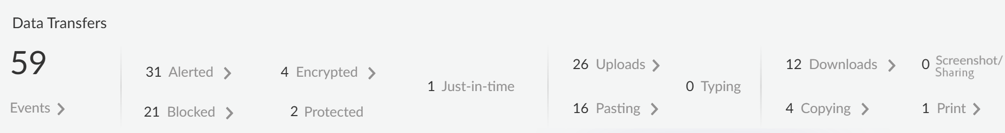 - Data in Motion—Total number of DLP Incidents that either generated an alert or were blocked through the SaaS Security Inline enforcement channel.