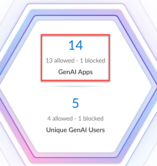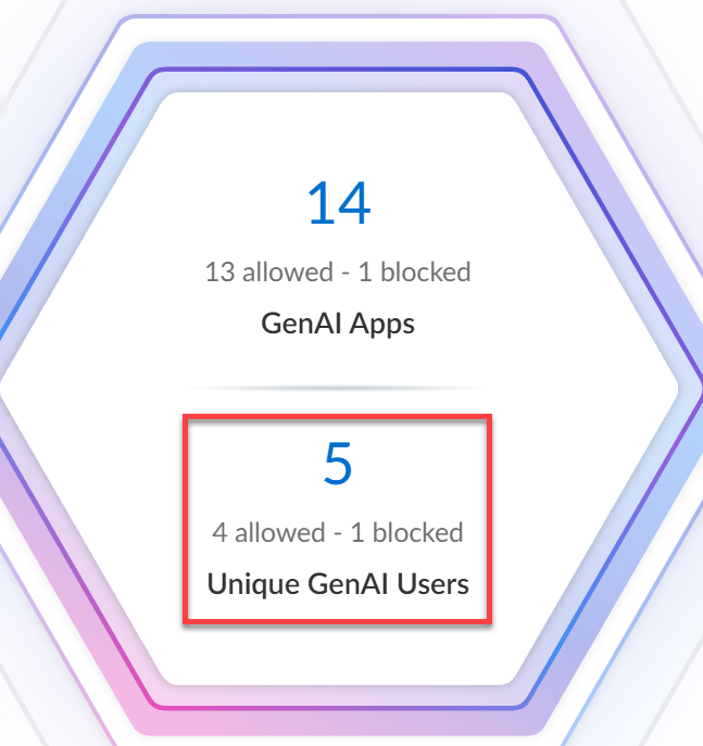 - Blocked Users—Total number of used blocked from accessing the GenAI app. Use this information to verify whether you configured Security policy rules controlling access for a specific GenAI app correctly, or to understand if users in your organization are accessing unsanctioned GenAI apps.