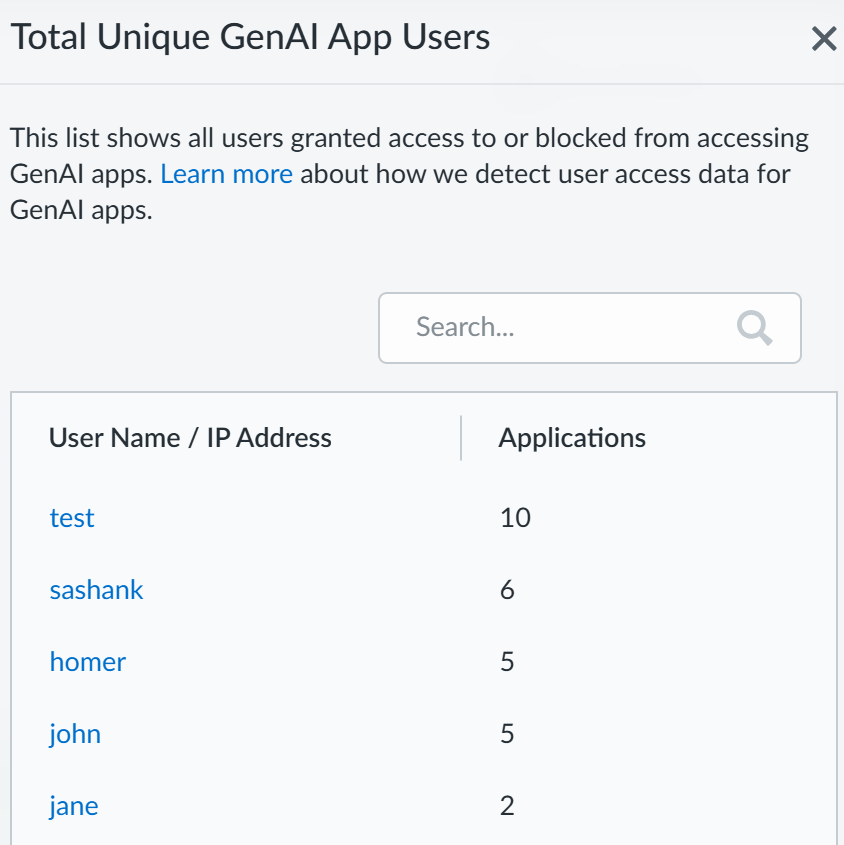 - Unique GenAI Users—Total number of users who accessed any GenAI app that falls into the particular use case. Click the Unique GenAI Users count to view a list of each unique user who was blocked from accessing the GenAI appAI Access Security automatically aggregates the total Unique GenAI Users count on a set interval and generates the user list immediately when you click on the Unique GenAI Users count. This might cause the Unique GenAI Users count to slightly differ from the list count.