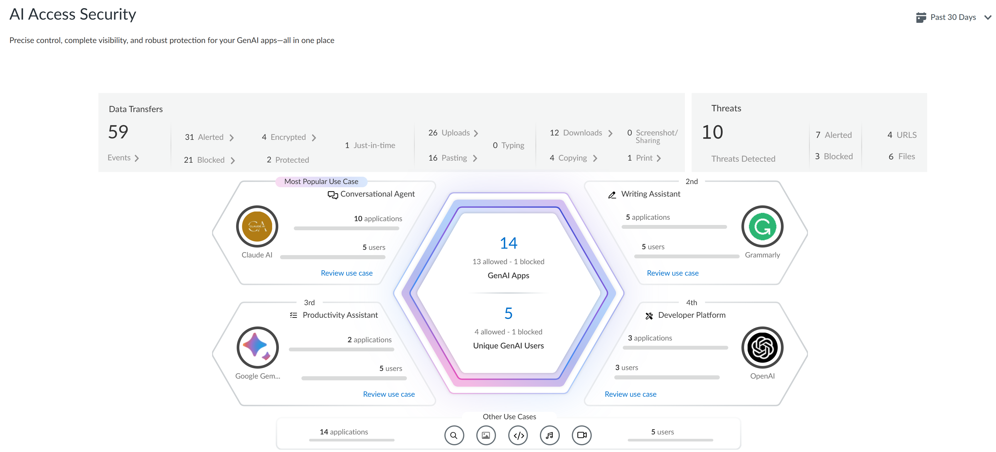 - Top Use CasesThe AI Access Security Insights dashboard dynamically displays the top four GenAI app use cases based on activity on your network, along with the total number of GenAI apps and users who accessed any GenAI in the selected time period. This allows you to quickly investigate security incidents related to your most widely used GenAI apps and implement access control policy rules.