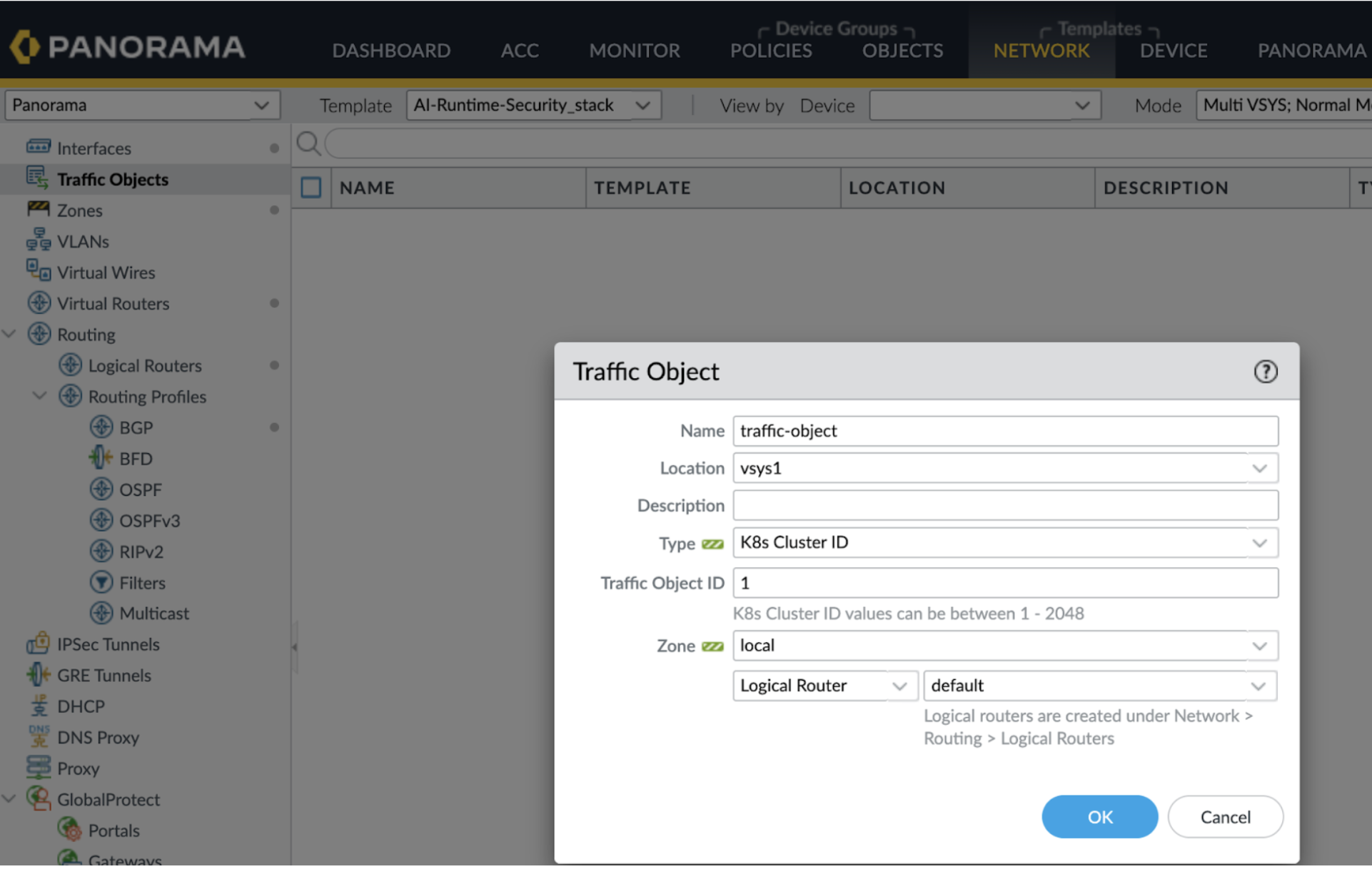 Create traffic objects to specify cloud entities within specific clusters or VPC endpoints to enforce customized security policy rules.This page helps you to create a traffic object with specific cloud assets and map the traffic object to a zone. Attach the zone to a security policy to enforce the policy rules on the AI traffic sourced from this zone. To create a policy object of type traffic objects:- Log in to the Panorama Web Interface.Navigate to Network Traffic Objects.Select Add.