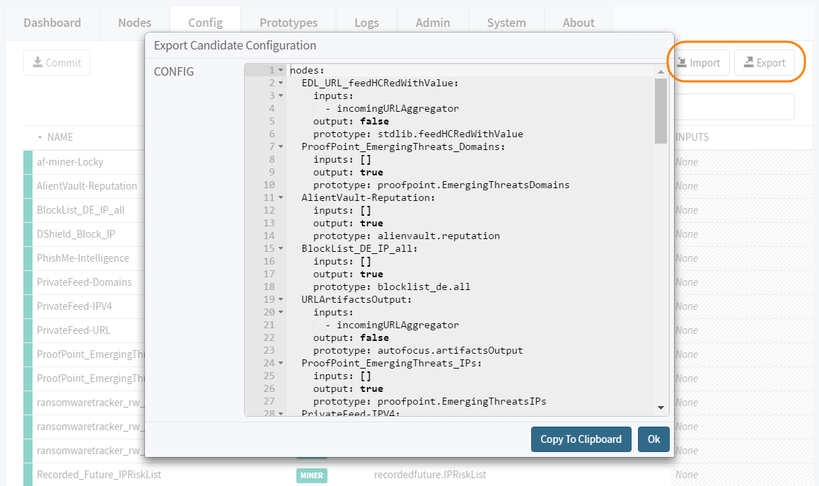 MineMeld user.Select the Config tab, and click Export. When you share the code that this generates with other MineMeld users, they can Import it into their MineMeld instance.Use the MineMeld import feature to quickly load another user’s nodes and node connections into your MineMeld instance. Importing a configuration replaces any nodes or node connections you have previously created.![]()