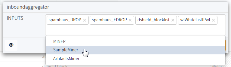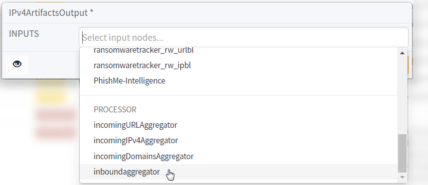 - Edit the Inputs for the node.To establish the connection between miner, processor, and output nodes, you must:- Select one or more miners from which a processor will receive indicators.![]()