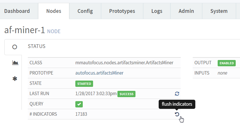 out indicators.When a miner node ages out indicators, it withdraws indicators from the outputs that received them. The samples miner has a default age-out interval of 24 hours, while the artifacts miner has a default interval of 30 days. To trigger these miners to age out indicators immediately, follow the steps below.- In MineMeld, select the samples or artifacts miner from the list of Nodes.
