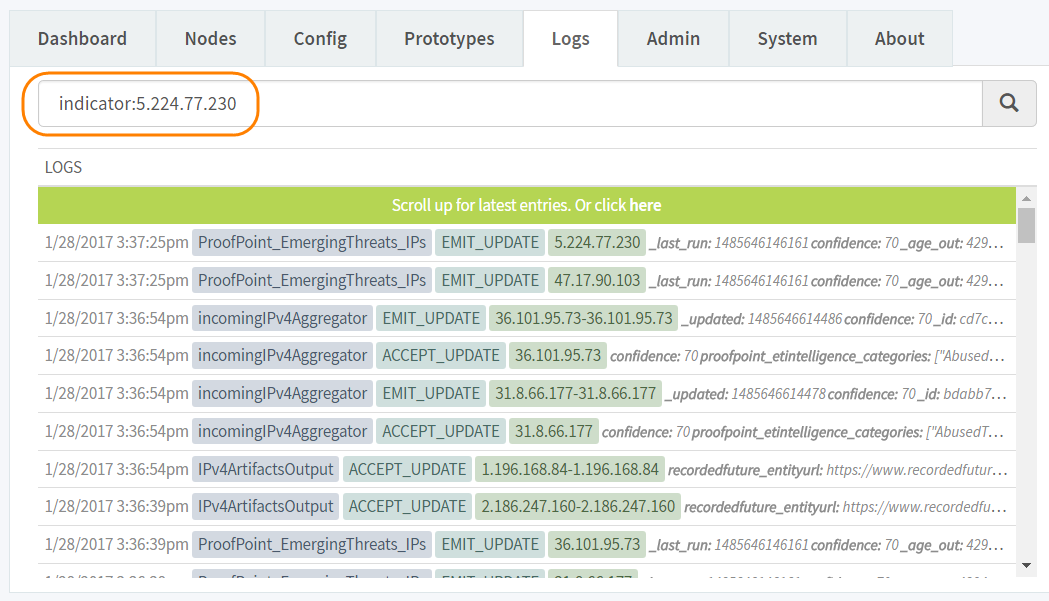 node and indicators that were aged out.View the MineMeld logs to determine if an indicator was successfully received by a node or aged out.- View the logs for a specific indicator.- In MineMeld, click the Logs tab.