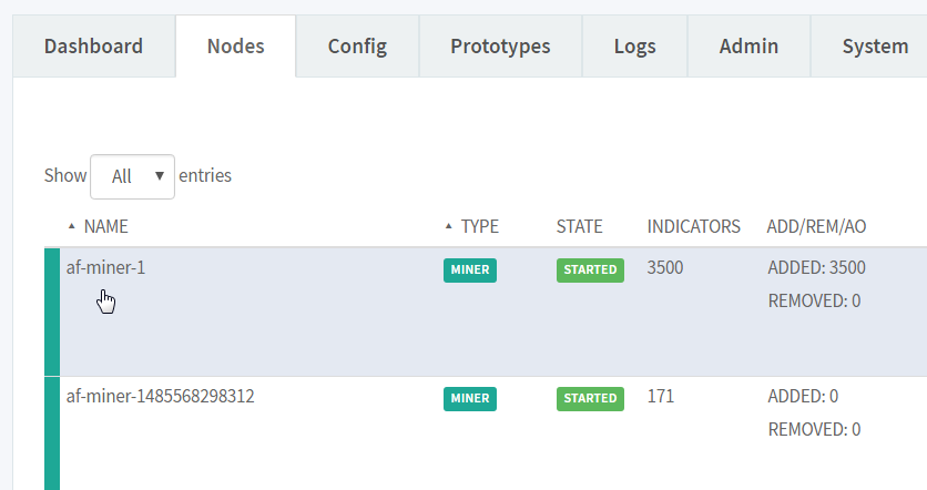 indicator activity associated with a node.- In MineMeld, select a node from the list of Nodes.