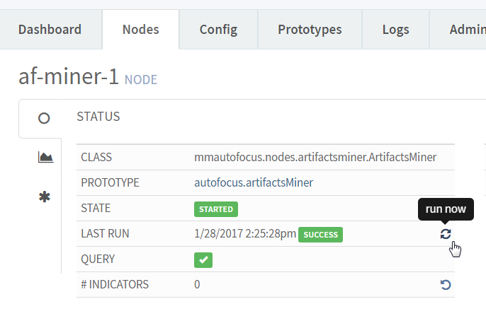 indicators.For a samples or artifacts miner, the default interval for retrieving and forwarding indicators to a processor is 1 hour. To trigger the miner to retrieve indicators immediately, follow the steps below.- In MineMeld, select the samples or artifacts