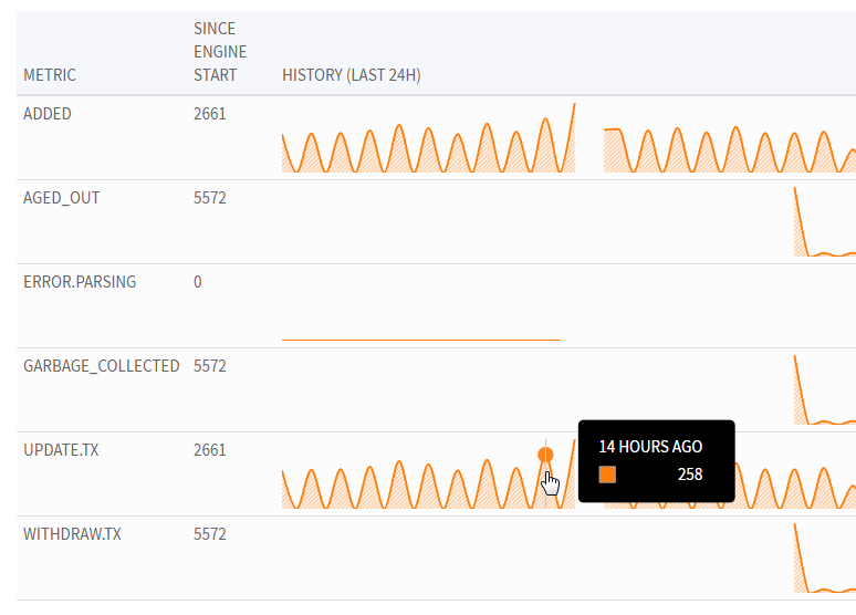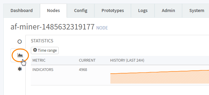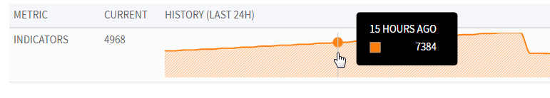 last 24 hours.![]()  - Compare the counts from different points in the Indicators graph to determine the number of new indicators that the node processed during a time range. A drop in the graph indicates that some indicators associated with the node were aged out.![]()