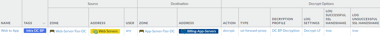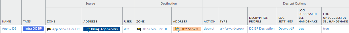 - This rule decrypts the traffic flowing between the application server tier and the database server tier for the Finance department’s billing servers.![]()