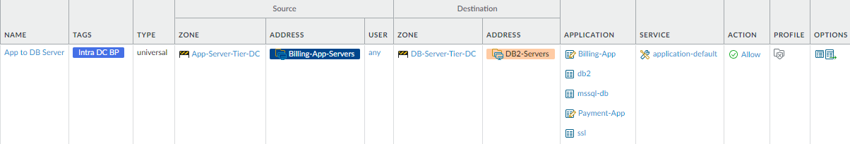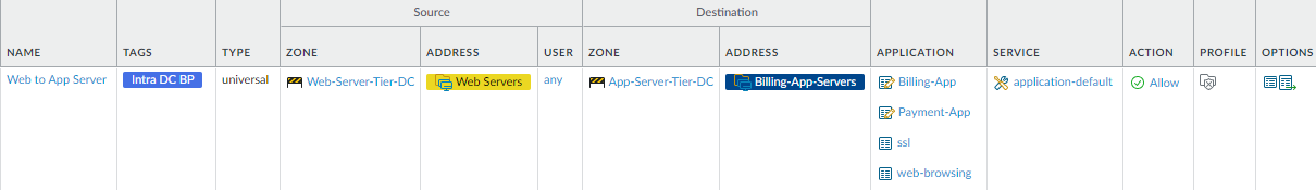 may be compromised. A common application architecture consists of three server tiers: web servers, application servers, and database servers. Apply best practice Security profiles to most traffic between server tiers to prevent threats. Don’t apply Security profiles to low-value, high-volume traffic such as mailbox replication and backup flows—the firewall already inspected the original flows, so spending CPU cycles on them provides no extra value. Do create allow rules for these applications to prevent misuse. For each rule, configure Log at Session End on the Actions tab and set up Log Forwarding to track and analyze rule violations.This example configures rules that allow traffic between application server tiers for two proprietary internal finance applications for which we created custom applications: Billing-App and Payment-App.- Allow finance application traffic between the web server tier and the application server tier.![]()