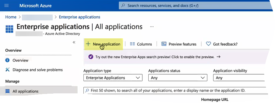 Select Enterprise applications and click New application.