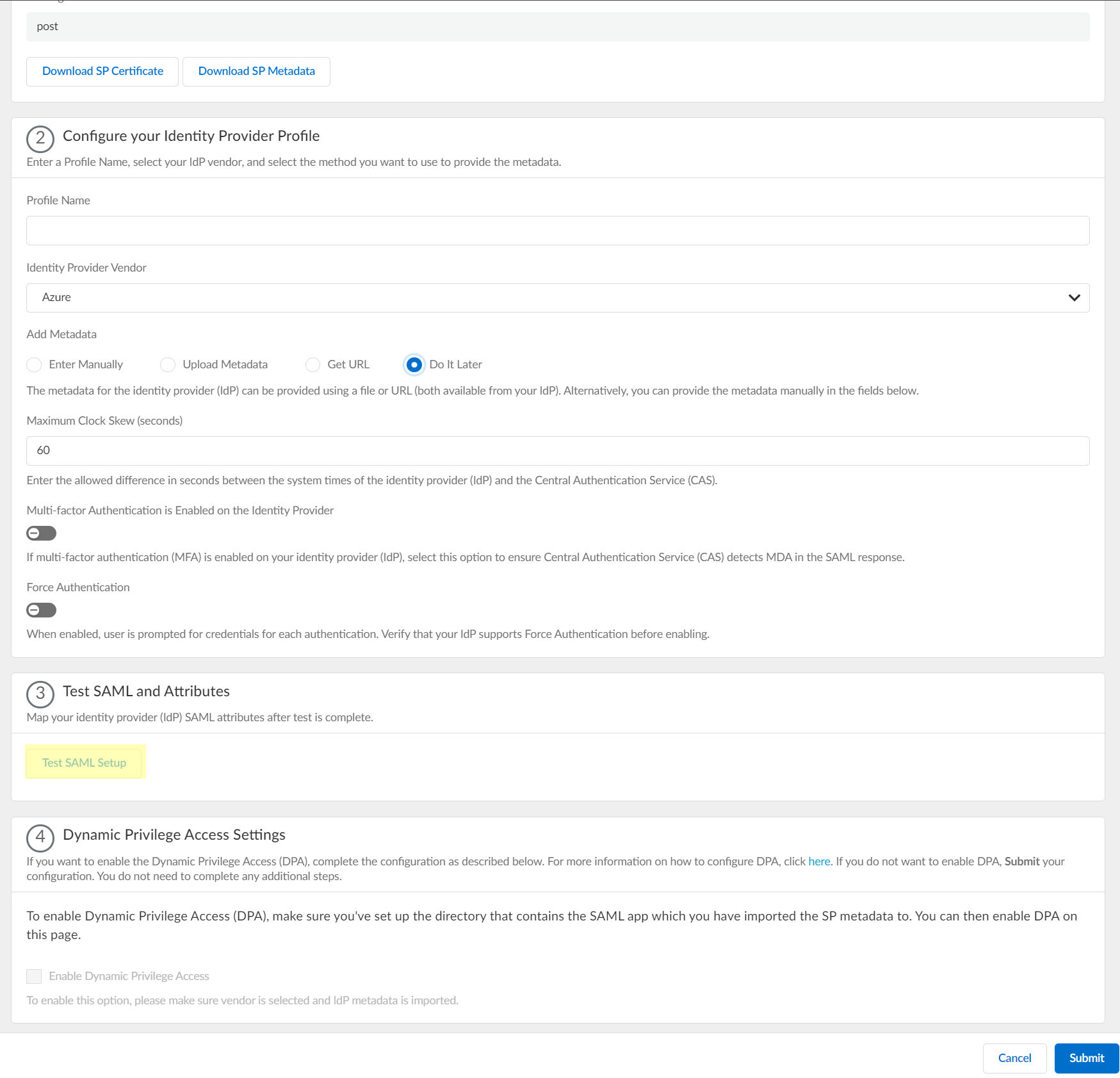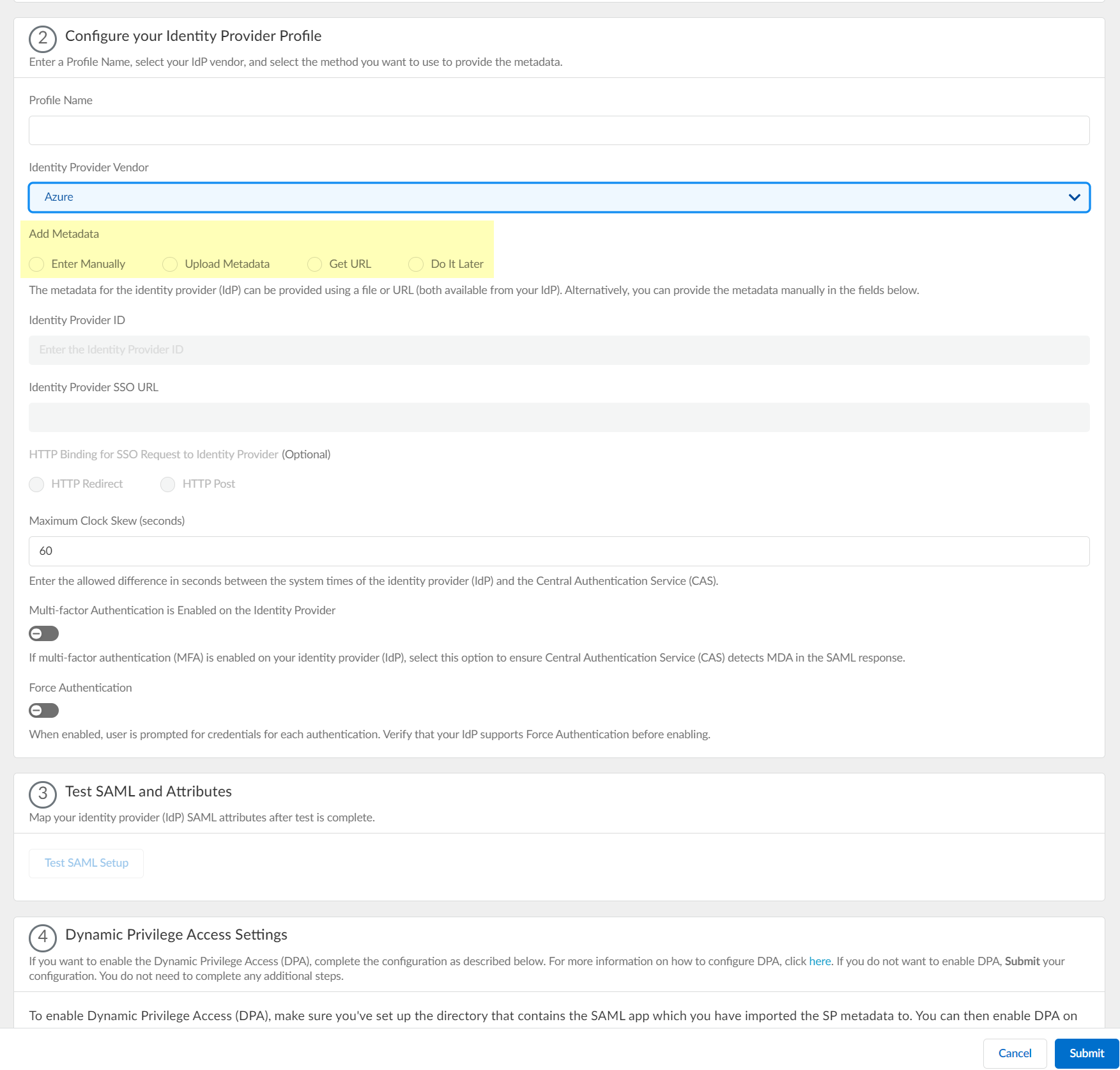 - To Configure Dynamic Privilege Access in the Cloud Identity Engine, select Dynamic service provider metadata.