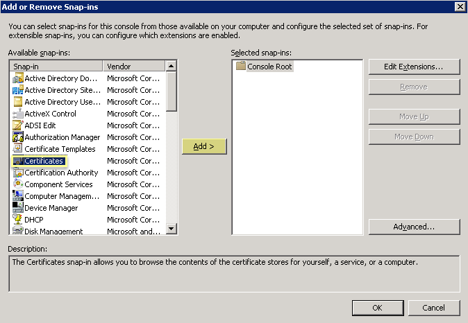 Click OK, then navigate to Console RootCertificates (Local Computer)PersonalCertificates.