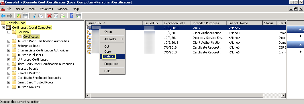 Select the previous certificate from the list.Right-click the certificate, then Delete and click Yes to confirm the deletion.Generate a new certificate to Authenticate the Agent and the Cloud Identity Engine and install it on the agent host.