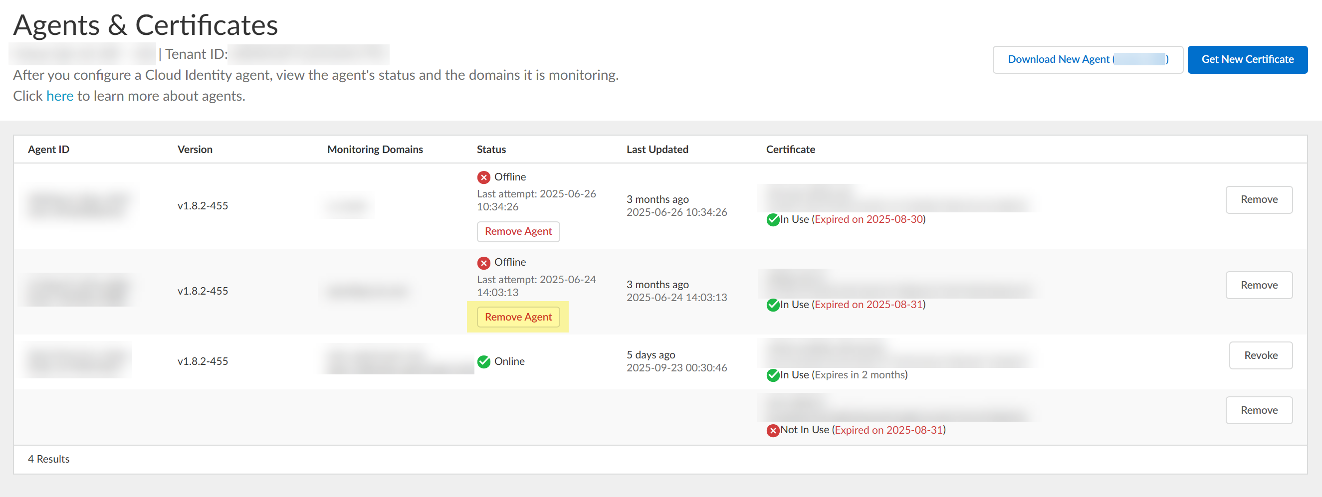 - Stop the connection to the Cloud Identity Engine.You must stop the connection between the agent and the Cloud Identity Engine before you can remove the agent.Uninstall the agent from the host server (StartControl PanelPrograms and FeaturesCloud Identity AgentUninstall).Log in to the hub and select the Cloud Identity Engine tenant that contains the agent you want to remove.Select Agents & Certificates.Confirm that the agent’s Status is Offline and click Remove Agent.You can only remove an agent that is offline (the connection between the agent and the Cloud Identity Engine is not active). If the agent is not offline, the Remove Agent button is not available.