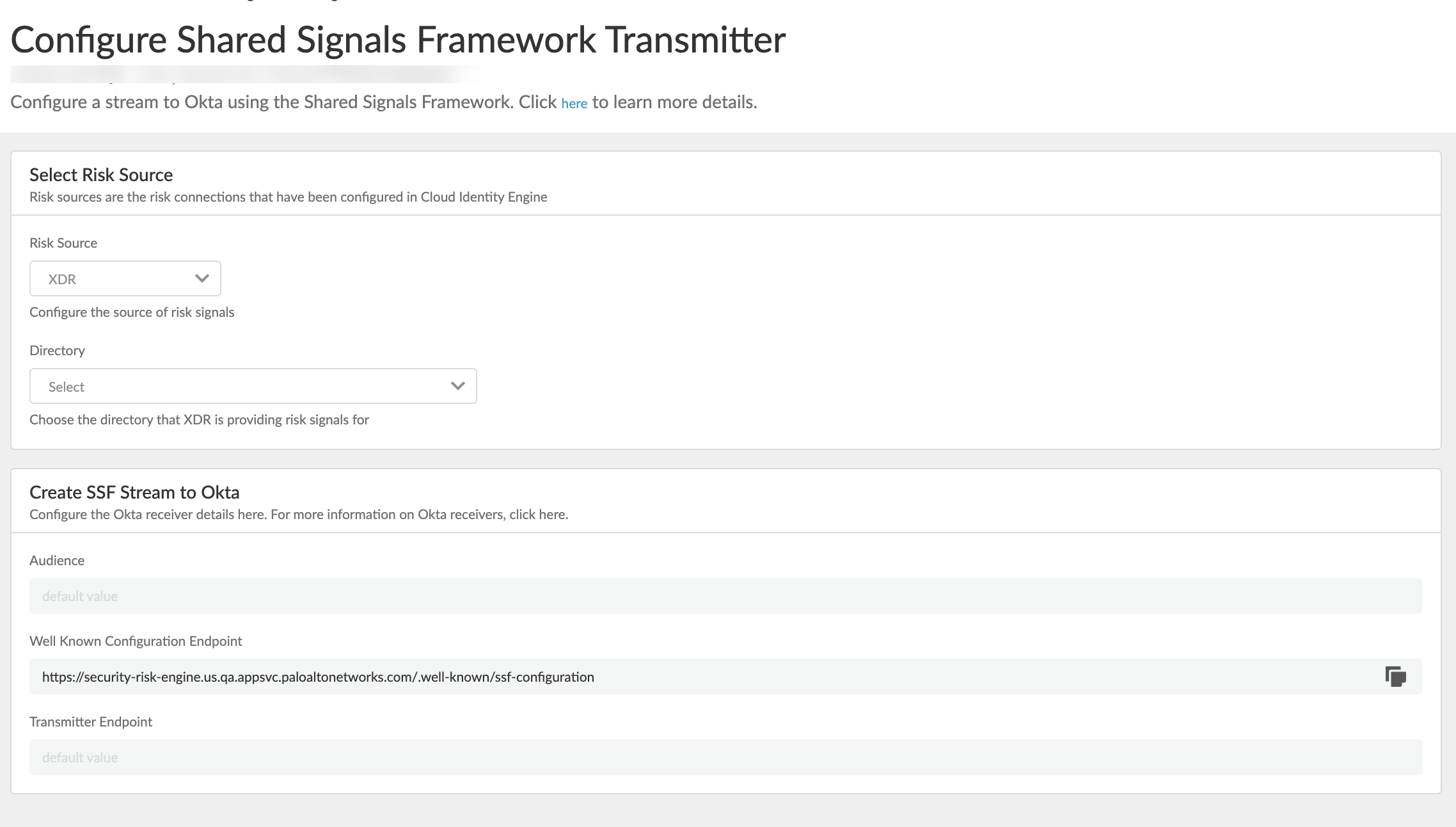 - Select Security RiskRisk Connections.Add a risk source.Connect Cortex, and then select an existing Cortex Directory.Click Continue.The Cortex directory you selected is added to the Risk Collection for Cortex.Configure the Shared Signals Framework Transmitter.