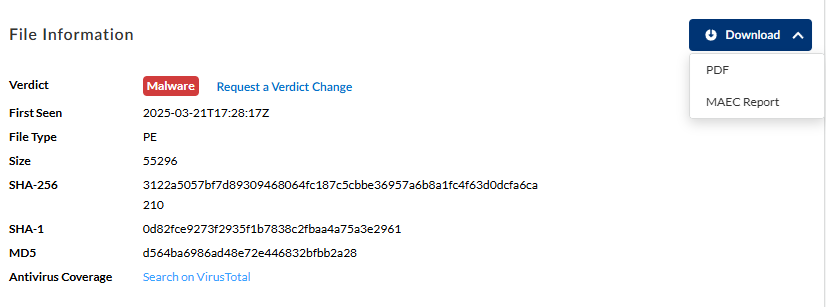 during WildFire analysis. You can download the report as a PDF or MAEC file in