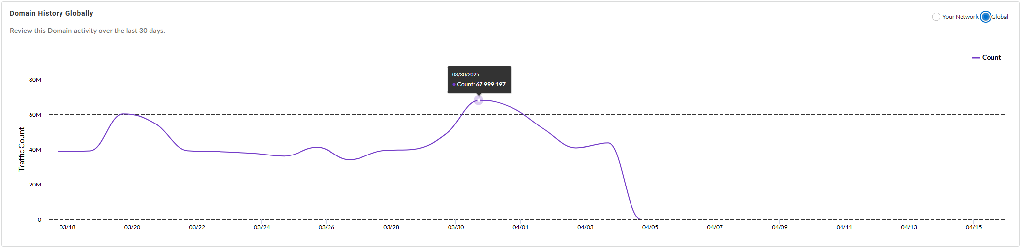 - Total number of activities associated with the domain over a specified duration, both in your network and globally.