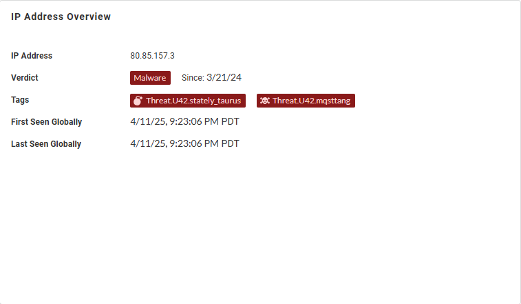 IP address, including the verdict, associated tags, and, if