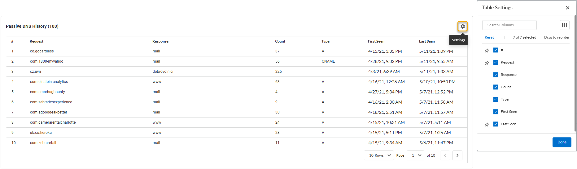 You can configure the fields displayed in the passive DNS