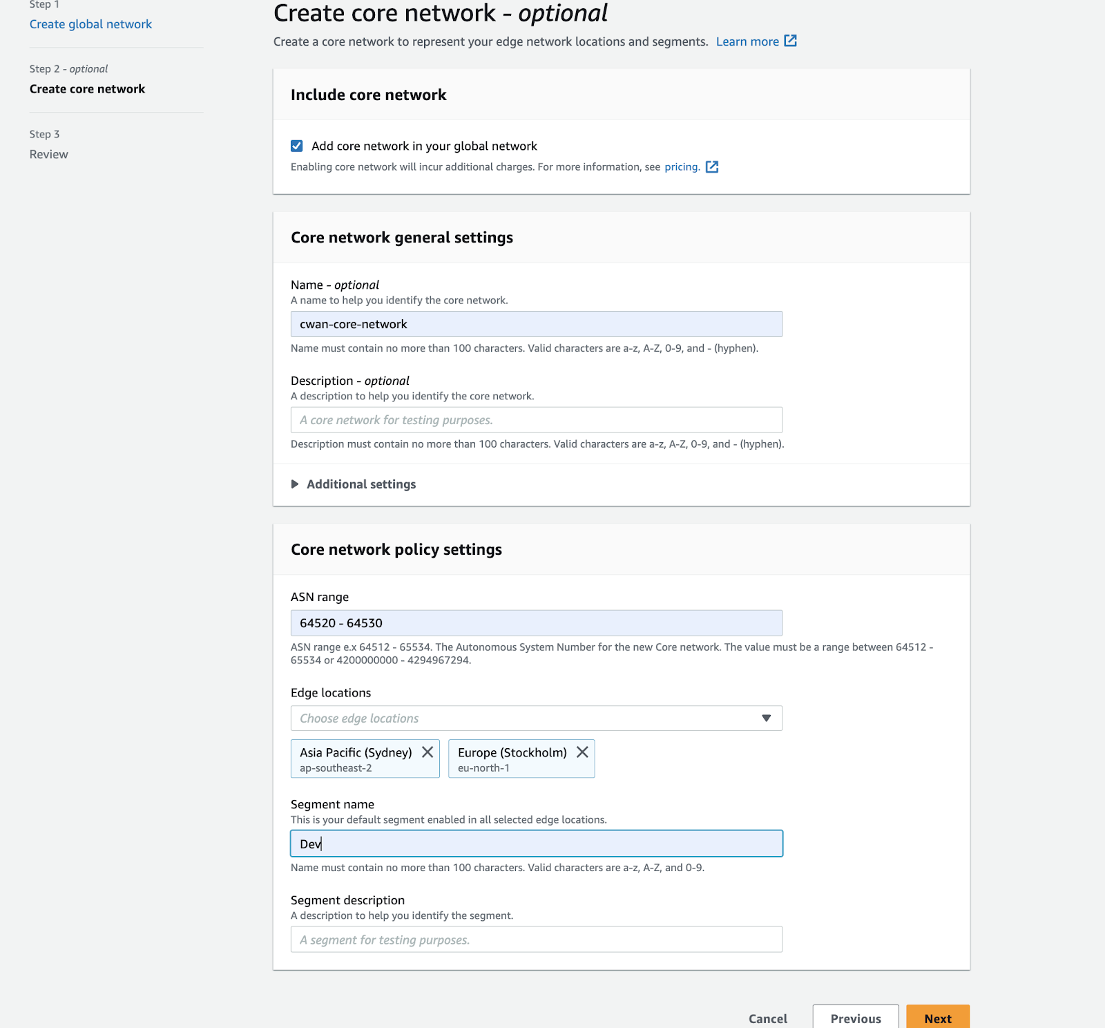 - While creating the core network, ensure that you add all the regions your VPCs are configured to, in the edge locations section under core network policy settings. You also need to create segments and add the type of segment (dev, prod, management, or security) that these regions belong to, under the segment name.