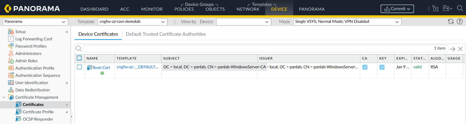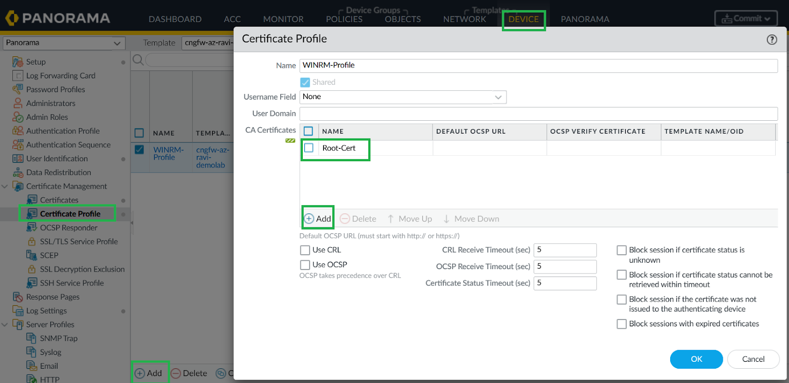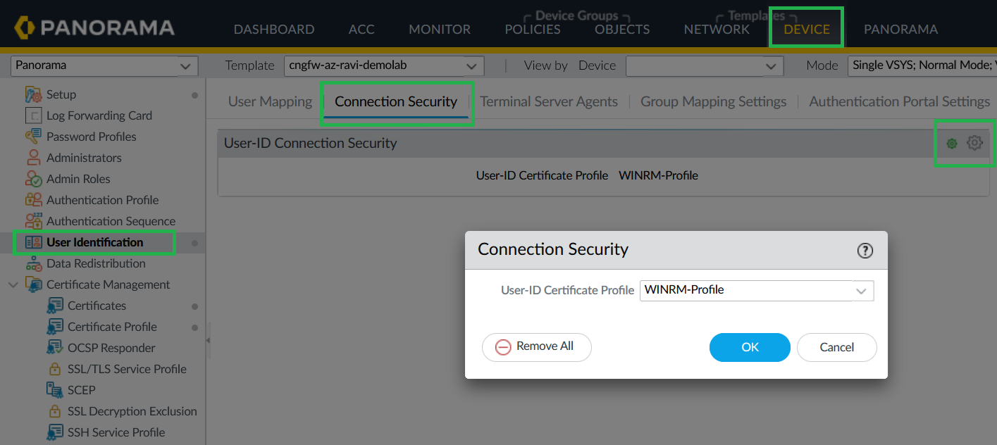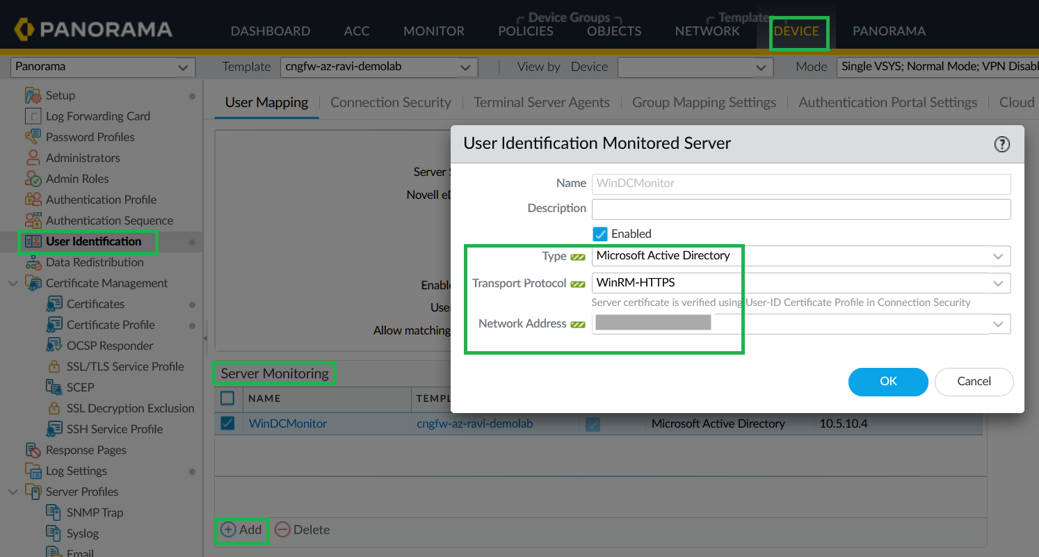 - Import Root Certificate.![]() In Panorama, go to Device > Certificate Management > Certificates, import the root certificate.Add Certificate Profile. In Panorama, go to Device > Certificate Management > Certificates, import the root certificate.Add Certificate Profile.- In Panorama, go to Device > Certificate Management > Certificates.Create a profile using the imported certificate.![]() Add Certificate Profile to User-ID Connection Security. Add Certificate Profile to User-ID Connection Security.- In Panorama, go to Device > User Identification > User Mapping.Edit User-ID Connection Security and assign the certificate profile.![]() Configure Server Monitor Account. Configure Server Monitor Account.- In Panorama, go to Device > User Identification > User Mapping.Provide the service account username/password for active directory.![]() Configure Server Monitoring (WinRM-HTTPS). Configure Server Monitoring (WinRM-HTTPS).- In Panorama, go to Device > User Identification > User Mapping > Server Monitoring.Select Microsoft Active Directory as type, WinRM-HTTPS as transport protocol, and Network Address as your Windows server address where you have an active directory configured.![]() The Cloud NGFW for Azure supports IP-to-user mapping using the Windows User-ID agent or Terminal Server Agent.Enable User-ID on Cloud NGFW Interfaces.As a best practice, always specify which networks to include and exclude from User-ID. This allows you to ensure that only your trusted assets are probed and that unwanted user mappings are not created unexpectedly. The Cloud NGFW for Azure supports IP-to-user mapping using the Windows User-ID agent or Terminal Server Agent.Enable User-ID on Cloud NGFW Interfaces.As a best practice, always specify which networks to include and exclude from User-ID. This allows you to ensure that only your trusted assets are probed and that unwanted user mappings are not created unexpectedly.- Select Netw`ork > Zones and select Zone where you're configuring User-ID.Add your networks to Include and Exclude lists as needed.Click OK.![]() On your Cloud NGFW device group, enable User-ID for both Private and Public zones. On your Cloud NGFW device group, enable User-ID for both Private and Public zones.![]() Configure Service Route to LDAP Server. Configure Service Route to LDAP Server.- In Panorama, go to Device > Setup > Services > Service Route Configuration.![]() Select LDAP as Service, loopback.3 as Source interface, and active directory IP address as Source address. Select LDAP as Service, loopback.3 as Source interface, and active directory IP address as Source address.![]() Commit your changes. Commit your changes.![]() Configure LDAP Server Profile. Configure LDAP Server Profile.- In Panorama, go to Device > Server Profiles > LDAP, add LDAP profile.![]() Use Base DN and Bind DN from AD (get via ADSI Edit). Use Base DN and Bind DN from AD (get via ADSI Edit).![]() Provide Bind DN password. Provide Bind DN password.![]() Configure Group Mapping. Configure Group Mapping.- In Panorama, go to Device > User Identification > Group Mapping.Add using the created LDAP profile.![]() For more information, see Configure User Mappings Using the Windows User-ID Agent and Configure User Mappings for Terminal Server UsersConfigure User-ID Master Device.In the Cloud NGFW device group, select the User-ID Master Device (choose one backend instance). For more information, see Configure User Mappings Using the Windows User-ID Agent and Configure User Mappings for Terminal Server UsersConfigure User-ID Master Device.In the Cloud NGFW device group, select the User-ID Master Device (choose one backend instance).![]() Commit your changes. Commit your changes.Enable User-ID with Windows-based User-ID AgentPrerequisites: - Active Directory (AD) environment with users and groups.