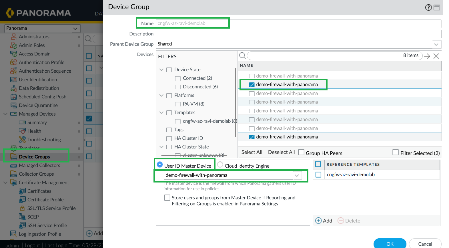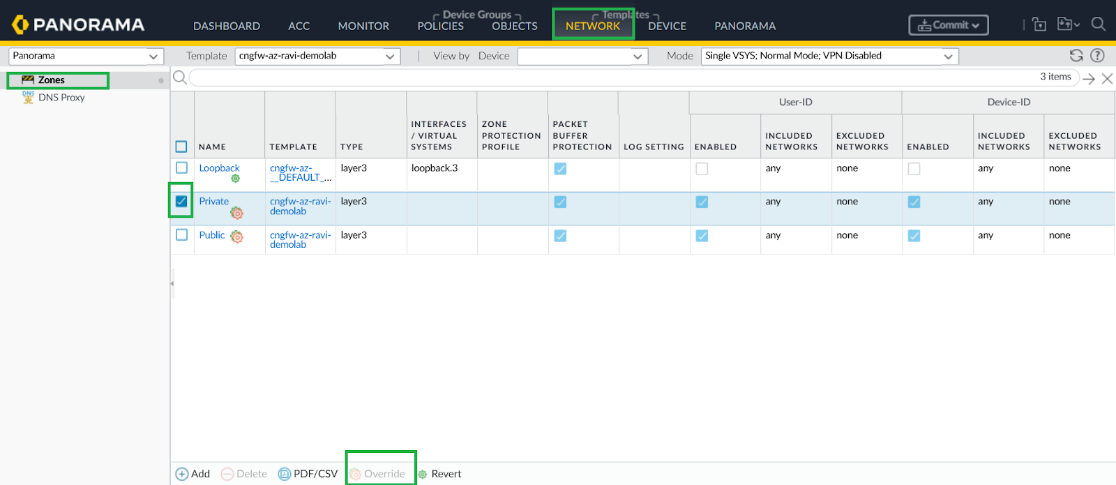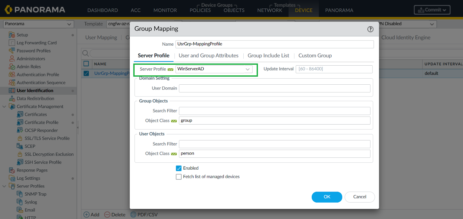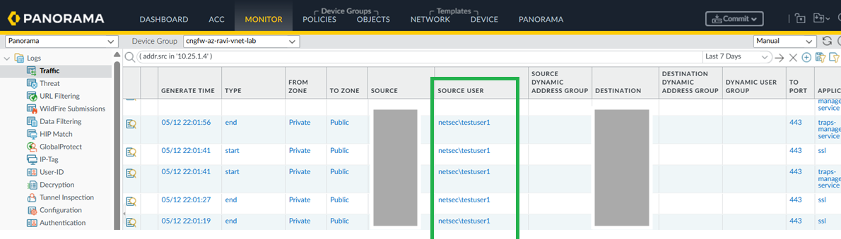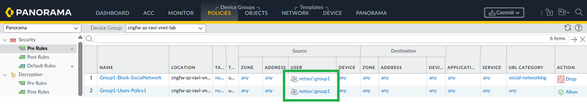 - Configure User-ID Redistribution Agent on Panorama.In Panorama, go to Data Redistribution > Add.In Add a Redistribution agent window, configure VM Seriesas the User-ID redistribution Agent on panorama.![]() Configure User-ID Redistribution Agent on Cloud NGFW Device Group.In Panorama, go to Device > Data Redistribution, and add a Data Redistribution Agent. Configure User-ID Redistribution Agent on Cloud NGFW Device Group.In Panorama, go to Device > Data Redistribution, and add a Data Redistribution Agent.![]() Enable User-ID on Cloud NGFW on Cloud NGFW network interfaces.You can override Private and Public zones and enable User-ID. Enable User-ID on Cloud NGFW on Cloud NGFW network interfaces.You can override Private and Public zones and enable User-ID.![]()  ![]() Commit the configuration and verify Data Redistribution from panorama.On Panorama commit and push the configuration. Commit the configuration and verify Data Redistribution from panorama.On Panorama commit and push the configuration.![]() Check for Cloud NGFW managed devices and take a note of the serial numbers. Check for Cloud NGFW managed devices and take a note of the serial numbers.![]() Configure LDAP Server Profile.Configure Group Mapping.Enable User-ID Master device.Commit your changes. Configure LDAP Server Profile.Configure Group Mapping.Enable User-ID Master device.Commit your changes.Define Firewall Policies Based on User GroupsIn Panorama, go to Policies > Security.![]() Create rules using the Source User field to define access based on active directory user groups. You can now monitor the traffic based on usernames instead of just IP addresses. Create rules using the Source User field to define access based on active directory user groups. You can now monitor the traffic based on usernames instead of just IP addresses.![]()  Limitations- Cloud NGFW can act as a redistribution Client, but not as a redistribution agent.