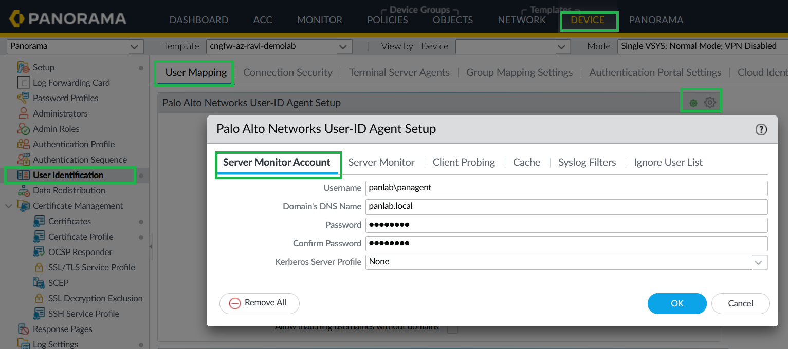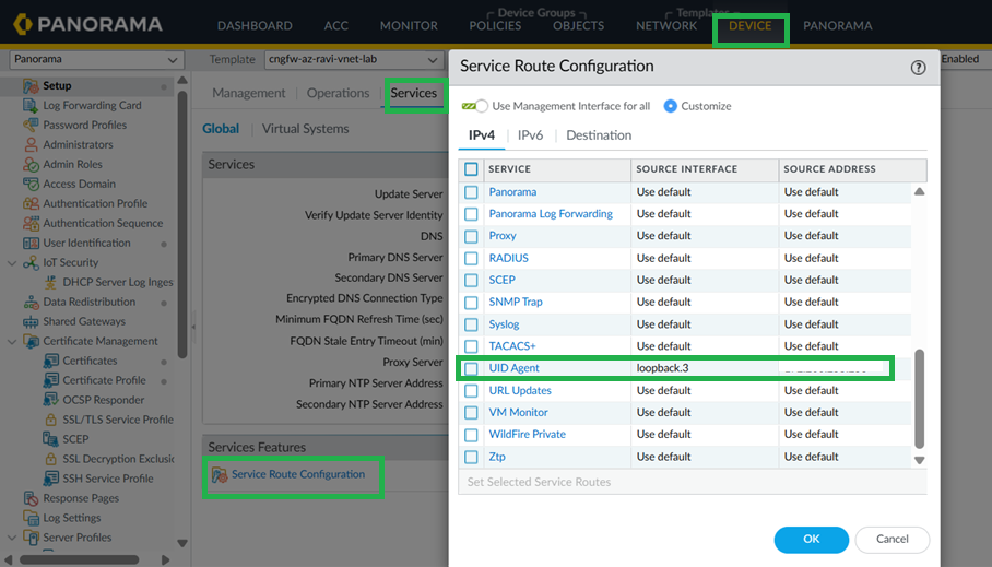 - Enable User-ID on Cloud NGFW Interfaces.- In Panorama, go to Network > Zones and select the Zone where you're configuring User-ID.Add your networks to Include and Exclude lists as needed.Click OK.![]() On your Cloud NGFW device group, enable User-ID for both Private and Public zones. On your Cloud NGFW device group, enable User-ID for both Private and Public zones.![]() Configure User-ID Agent as Data Redistribution Agent.In Panorama, go to Device > Data distribution. Configure your User-ID Agent as data redistribution agent. Configure User-ID Agent as Data Redistribution Agent.In Panorama, go to Device > Data distribution. Configure your User-ID Agent as data redistribution agent.![]() Configure Service Route for User-ID Agent. Configure Service Route for User-ID Agent.- Go to Setup > Services > Service Route Configuration.![]() Configure with source interface as loopback.3.Add Firewall policy to allow communication towards User-ID Agent windows server.Verify User-ID Agent Configuration. Configure with source interface as loopback.3.Add Firewall policy to allow communication towards User-ID Agent windows server.Verify User-ID Agent Configuration.- On the Windows server, click Edit to open User-ID Agent.![]() Add service account username and password.Ensure that you have the appropriate User-ID service port (5007 by default) configured.Configure the discovery of your active directory domain (Auto-Discover if on the same server). If you have an active directory within the same server where you have User-ID Agent installed, you can use the Auto Discover option. Add service account username and password.Ensure that you have the appropriate User-ID service port (5007 by default) configured.Configure the discovery of your active directory domain (Auto-Discover if on the same server). If you have an active directory within the same server where you have User-ID Agent installed, you can use the Auto Discover option.![]() Commit your changes. Commit your changes.![]() You will be able to see the Agent status as running and the connected servers. Ensure that you disable Windows firewall on this windows server to allow communication from CNGFW to this UID Agent.Configure LDAP Server Profile.Configure Group Mapping.Enable User-ID Master device.Commit your changes. You will be able to see the Agent status as running and the connected servers. Ensure that you disable Windows firewall on this windows server to allow communication from CNGFW to this UID Agent.Configure LDAP Server Profile.Configure Group Mapping.Enable User-ID Master device.Commit your changes.Enable User-ID with Cloud Identity Engine (CIE)Prerequisites: - Active Directory (AD) environment with users and groups.