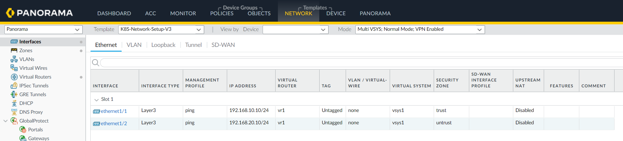 Commit your changes on Panorama.Click Commit to Panorama. The commit creates four templates—K8S-Network-Setup, K8S-Network-Setup-V2, K8S-Network-Setup-V3, and K8S-Network-Setup-V3-HA. It can take up to one minute for the interfaces to display on Panorama.- K8S-Network-Setup is for use with the CN-Series as a DaemonSet and has 30 virtual wires; a pair of interfaces that are part of a virtual wire to secure an application. Therefore, the CN-NGFW as a DaemonSet can secure a maximum of 30 application pods on a node.