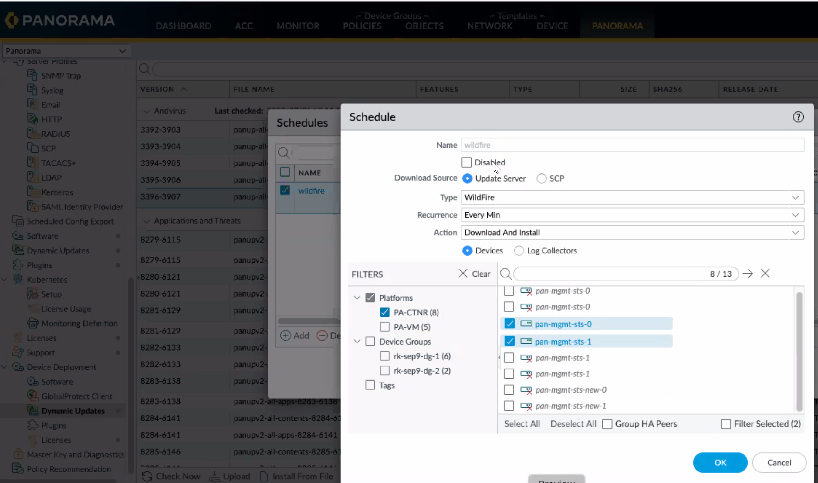 you have purchased.You can either install it manually or set up a schedule. Verify the serial numbers of the CN-MGMT pods when selecting them for the dynamic updates.or on a recurring schedule.![]()  ![]()