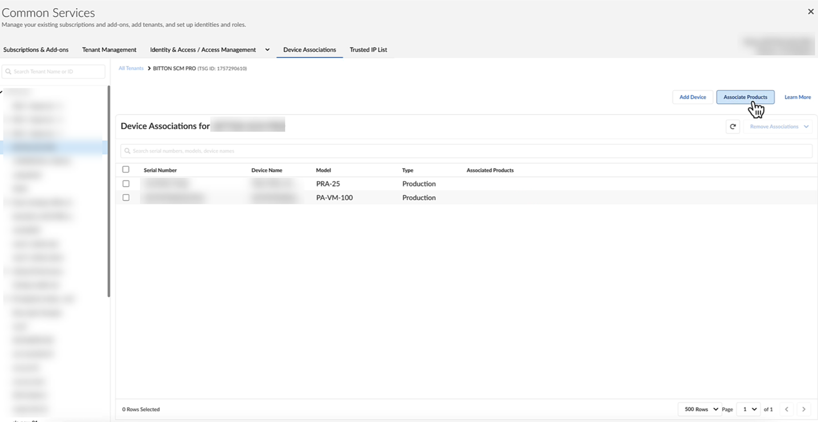 - Select Associate Products.In the Products selection column, select the product you want to associate.If applicable, select the type of license.Some products have licenses for specific validity terms and device models. Only the devices compatible with the license type you selected will appear for association.Select devices.Save or Apply Licenses.Verify that the association was successful.If the association failed, copy the error ID and follow the steps to open a support case. When opening the support case, be sure to include the error ID, device serial number, TSG ID, and the name of the product that failed association.Return to the documentation for the product you are associating for further onboarding steps.