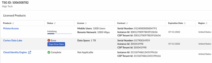 - Use one of the various ways to access Common ServicesTenant Management.Select Tenant Management. Only one way is shown here.![]() Navigate to your tenant and view the license activation status.If the license activation has failed, then you can see the error status and Copy Error Data. Navigate to your tenant and view the license activation status.If the license activation has failed, then you can see the error status and Copy Error Data.![]() Copysupport case automatically directs you to the support portal to paste the product information and file a support case. Copysupport case automatically directs you to the support portal to paste the product information and file a support case.![]()