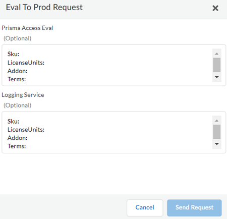 Specify the licenses you would like on your production tenant and Send Request. The request is looked at your Palo Alto Networks account representative to create a quote. Some examples include the following:- Sku: Prisma Access