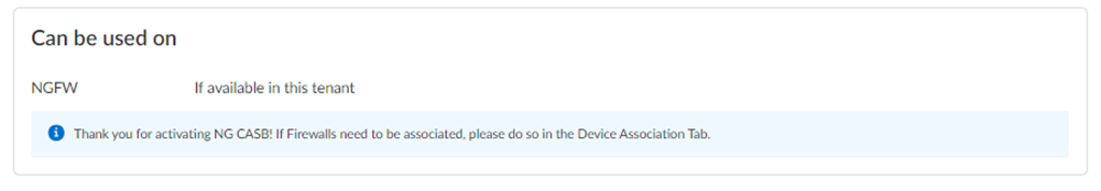 Agree to the terms and conditions, and Activate.This tenant, and any others created by this Customer Support Portal account, will have the Superuser role.CASB-X activation is now complete for Prisma Access. To apply CASB-X on NGFW, you must go to the Device Association tab to select the devices and apply Next-Generation CASB on them:(Optional) Manage your product from Strata Cloud Manager.(Optional) Manage identity and access.Return Visit CASB-X Activation