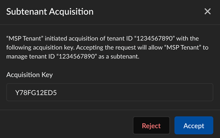 Confirmation is displayed. Select Close.(Optional) If you are one of the administrators contacted in the request to acquire an external tenant, and you’re already logged into the Strata Cloud Manager, but you don’t have the email:- Select View Request from the banner.At the prompt, you can select to resend the acquisition key.Enter the acquisition key from your email.Accept.Confirmation is displayed. Close.