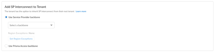If you selected to use a Service Provider backbone, you can Set Region Exceptions to exclude internet service provider backbones in these regions. The excluded regions use Prisma Access for network backbone instead.