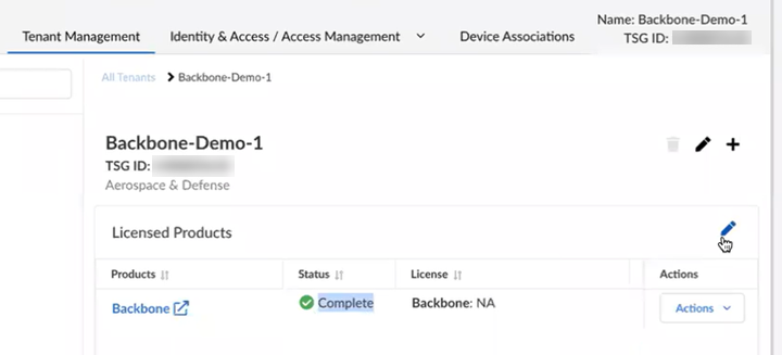 - Use one of the various ways to access Common ServicesTenant Management.Search or scroll to the tenant where you activated the SP backbone license.Edit the licensed product for the SP backbone or Prisma Access.
