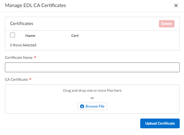 - To create a new EDL entry:(Required if your EDL source requires a CA certificate to establish a secure connection) Upload CA certificate(s) to Strata Cloud Manager.