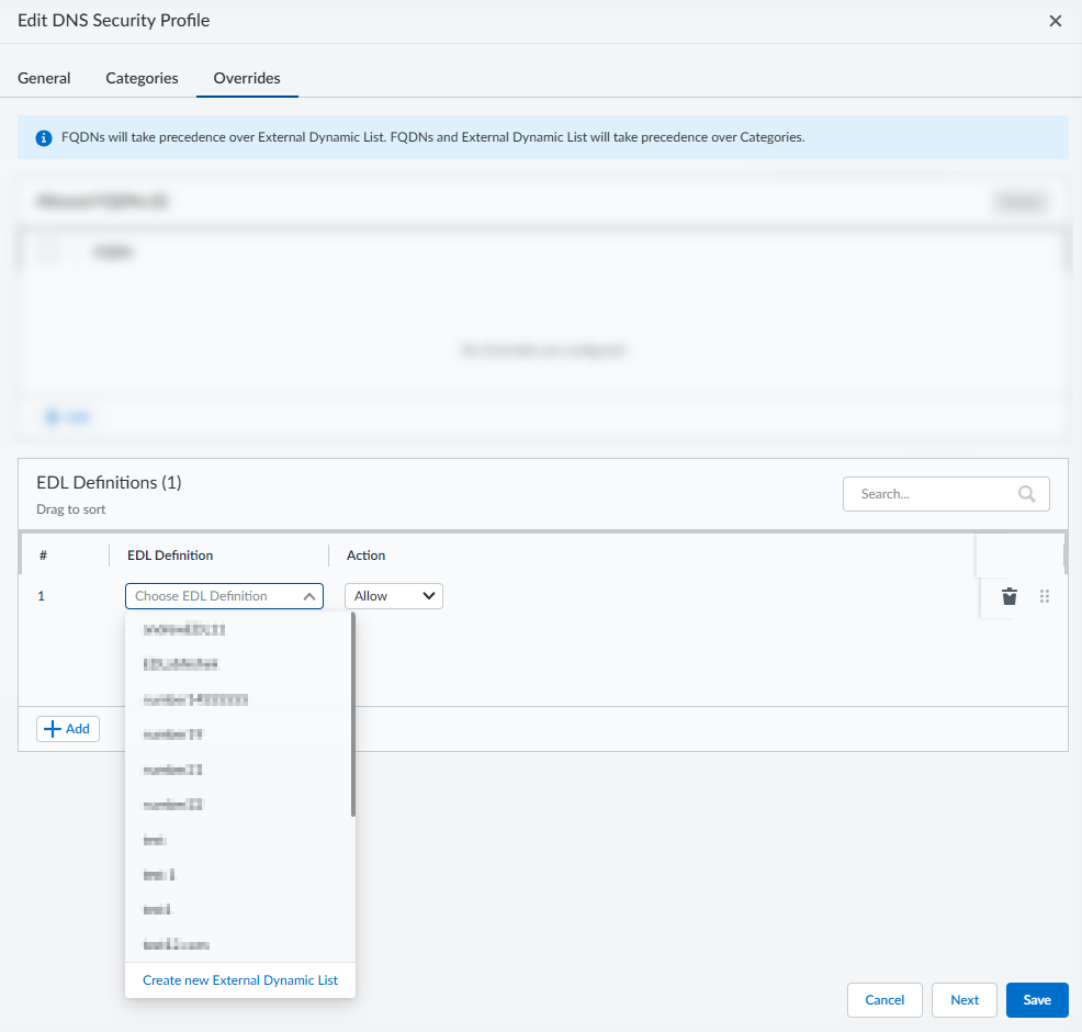 Test to verify that it is accessible and usable by the Advanced DNS Security Resolver. A confirmation appears in the upper-right corner.Save your EDL definition.To apply the EDL to a DNS Security Profile:Select ManageConfigurationADNS Resolver and then go to the DNS Security Profiles tab.Select a DNS Security profile that you want to apply the EDL to and select Overrides tab.![]() From the EDL Definitions panel, + Add or delete entries (using the icon) to modify the EDL list entries as necessary. Keep in mind, only EDL lists that have been previously created can be added.Select an Action for each EDL list entry. From the EDL Definitions panel, + Add or delete entries (using the icon) to modify the EDL list entries as necessary. Keep in mind, only EDL lists that have been previously created can be added.Select an Action for each EDL list entry.- allow—The DNS query is allowed.