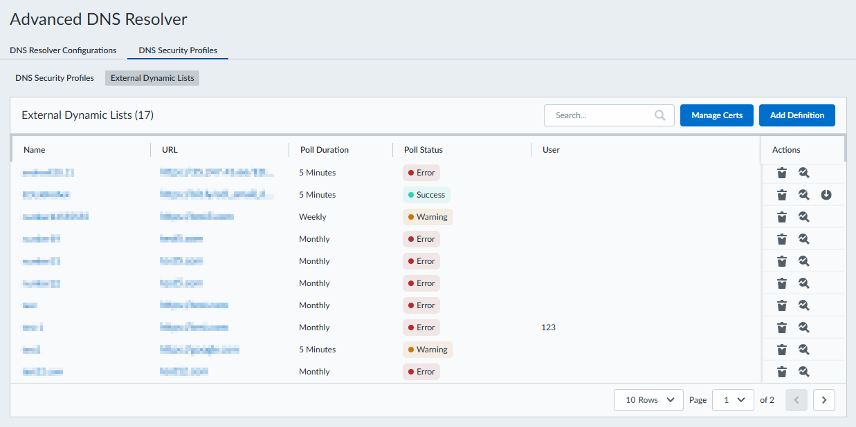 - Log in to the Strata Cloud Manager on the hub.Select ManageConfigurationADNS ResolverDNS Security Profiles and then go to the External Dynamic Lists tab.You can view your available EDLs and get a at-a-glance status of each EDL. Additionally, you can delete, test, and download the associated certificate for each EDL that was previously added.![]()