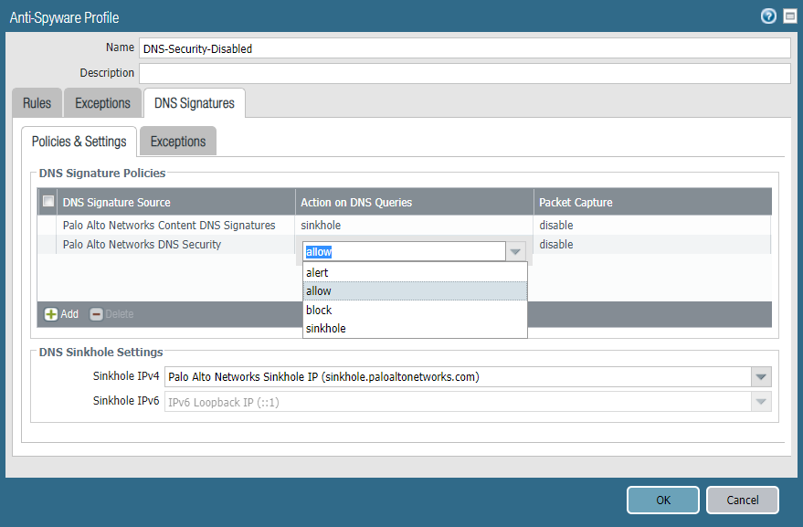 - Select ObjectsSecurity ProfilesAnti-Spyware.Select the profile containing your active DNS Security policy settings.Select the DNS Signatures tab.Under Policies & Settings, set the policy action for Palo Alto Networks DNS Security to an action of allow.