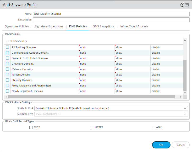 - Select ObjectsSecurity ProfilesAnti-Spyware.Select the profile containing your active DNS Security policy settings.Select the DNS Policies tab.For each DNS category, set the log severity to none, the policy action to allow, and packet capture to disable. In the following, the DNS Security categories have been configured to bypass DNS Security queries.